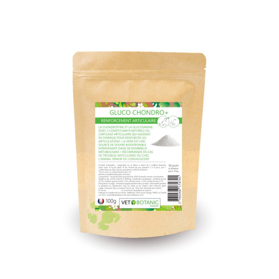 La chondroïtine et la glucosamine sont 2 constituants naturels du cartilage articulaire qui agissent en synergie pour renforcer les articulations. Le MSM est une source de soufre biodisponible intervenant dans de nombreux métabolismes. Recommandé en cas de troubles articulaires ou chez l’animal sénior ou convalescent.