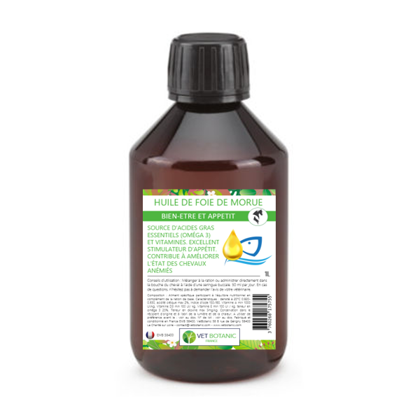 L’huile de foie de morue est source d’acides gras essentiels (oméga 3) et vitamines. Cette huile est un excellent stimulateur d’appétit et contribue à améliorer l’état des chevaux anémiés ou âgés.