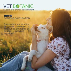 Grâce à la présence de calcium, de potassium, de silicium et de fer, l’ortie a une action reminéralisante. Elle est donc bénéfique en cas de perte de masse osseuse et fragilité. Particulièrement riche en silice, cette plante est traditionnellement utilisée lors de raideur articulaire. En effet la silice végétale est très bien tolérée par l’organisme et favorise ainsi la reminéralisation osseuse de votre animal. De plus, ses feuilles contenant une quantité importante de chlorophylle, favorise la purification et la détoxication de l’organisme. Cet aliment complémentaire pour chat et chien assainit également le système digestif et lutte contre les ballonnements.