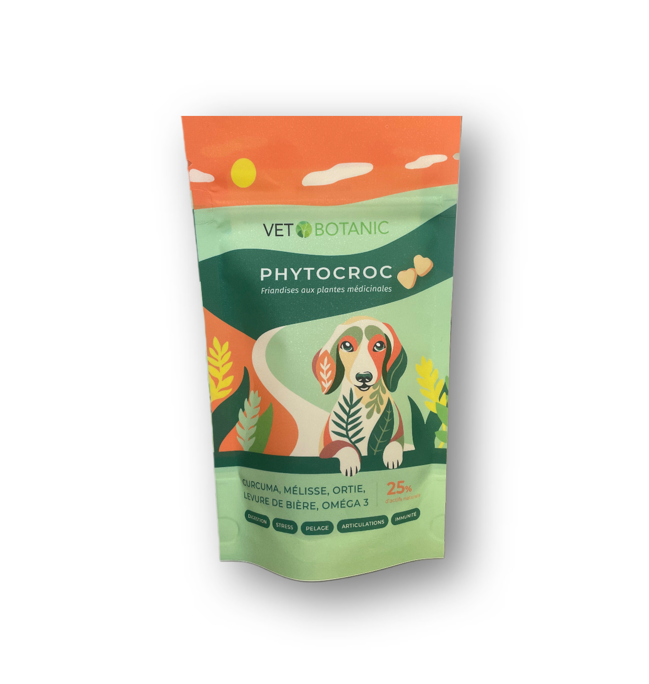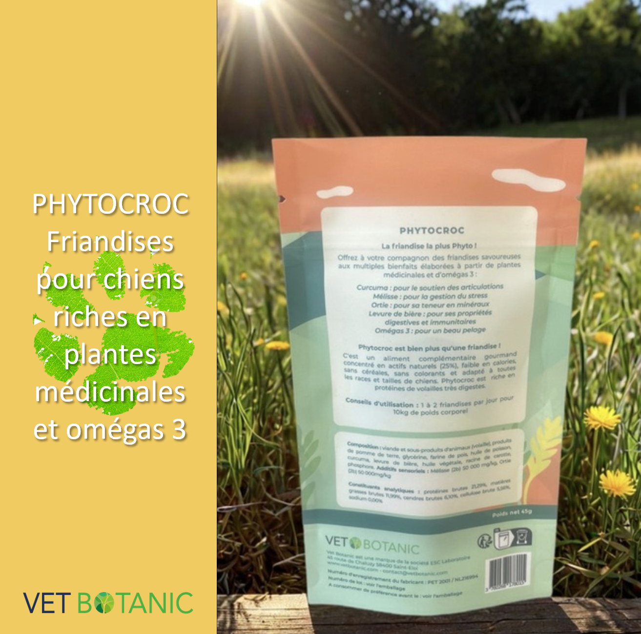 Phytocroc est un aliment complémentaire gourmand concentré en actifs naturels (25%), faible en calories, sans céréales, et adapté à toutes les races et tailles de chiens.