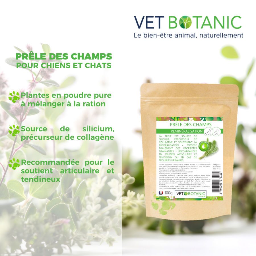 La prêle des champs, particulièrement riche en silicium (5-8%), stimule la synthèse de collagène contenu dans les tissus osseux et conjonctifs. En d’autres termes, cela favorise la reconstitution des cartilages. Elle améliore sensiblement la souplesse des tendons et aide à leurs protections lors d’effort. En conséquence, l’utilisation de la prêle des champs est recommandée pour les chiens et chats en phase de croissance. De même, les carences en silicium sont fréquentes et augmentent avec l’âge, d’où l’intérêt de faire des cures régulières à votre animale.